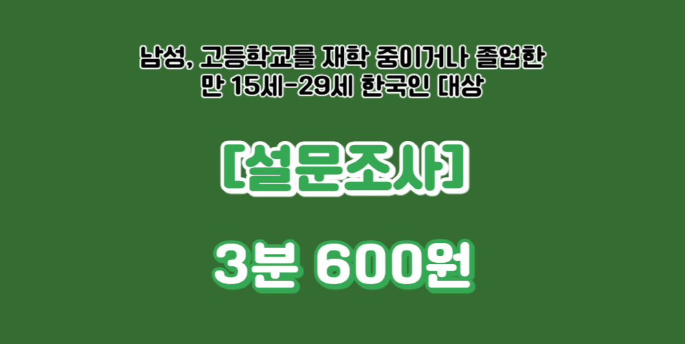5. 설문 대상자 : 남성, 고등학교를 재학 중이거나 졸업했음, 만 15세-29세, 한국인 (장기간 외국 경험 가능)
